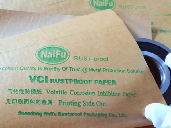 4、包裝過程---將含有緩蝕劑的面朝向金屬包裝,不覆膜防銹紙可作為金屬產(chǎn)品間墊層隔材使用,以免其他材質(zhì)阻隔材料含S、CL化學成分,影響防銹效果